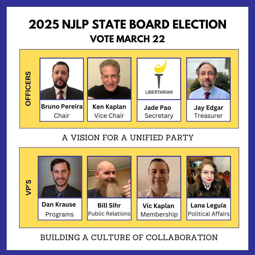 We would like to present the following slate to members of the New Jersey Libertarian Party as who we believe will steer our Party towards success and growth. Our mission statement, restoring our Party’s commitment to non-aggression and tolerance by fostering a welcoming environment for new and existing members. We commit ourselves fully towards NJLP members by presenting the following roadmap to success.